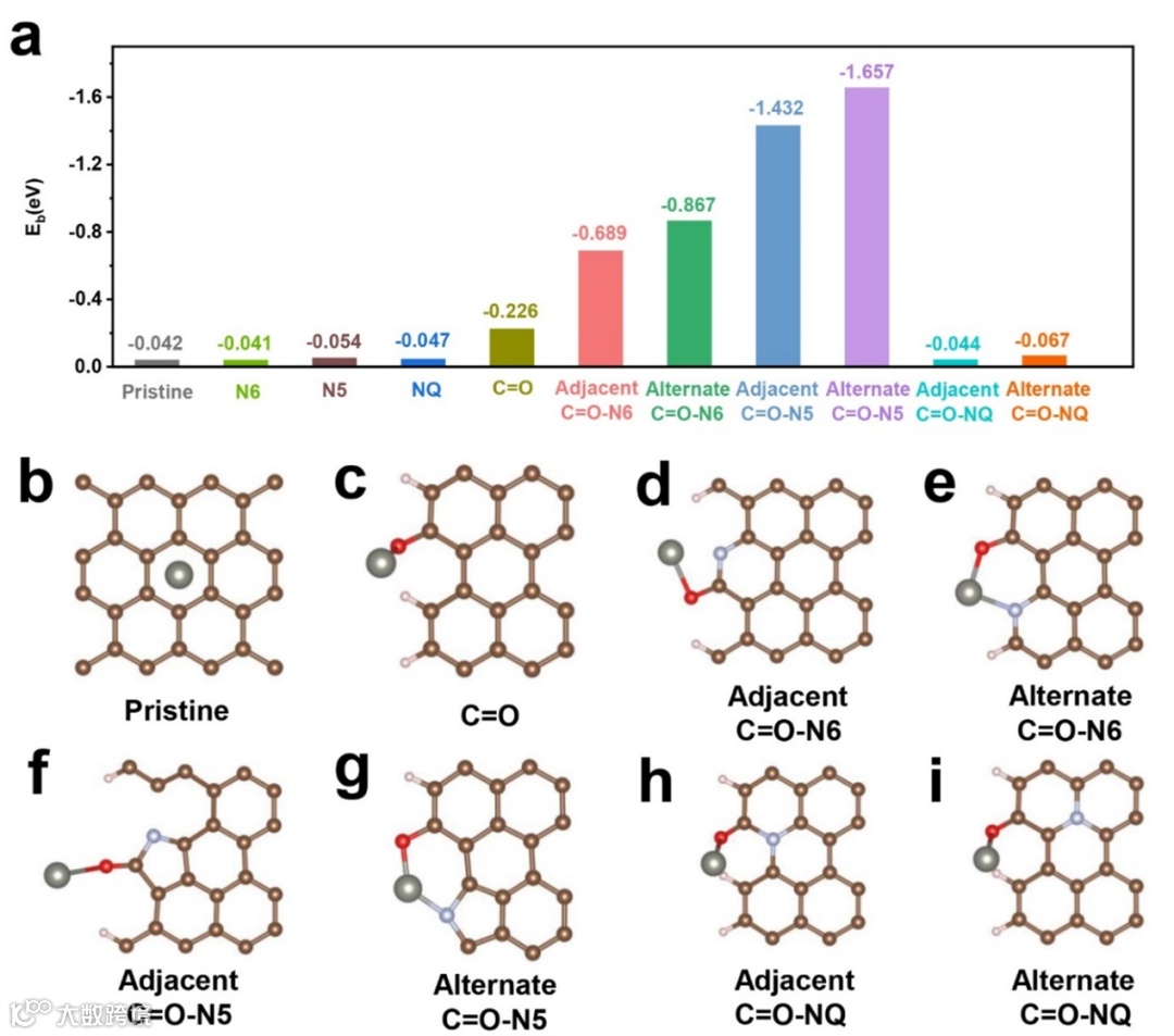 图4. (a)Zn原子在原始石墨烯和不同官能化石墨烯表面的结合能;优化的吸附模型:Zn吸附在(b)理想石墨烯;(c)羰基官能化石墨烯;(d)邻位N6掺杂和羰基官能化石墨烯;(e)间位N6掺杂和羰基官能化石墨烯;(f)邻位N5掺杂和羰基官能化石墨烯;(g)间位N5掺杂和羰基官能化石墨烯;(h)邻位NQ掺杂和羰基官能化石墨烯;(i)间位NQ掺杂和羰基官能化石墨烯。棕色、白色、红色和灰色球分别代表C、H、O和Zn原子