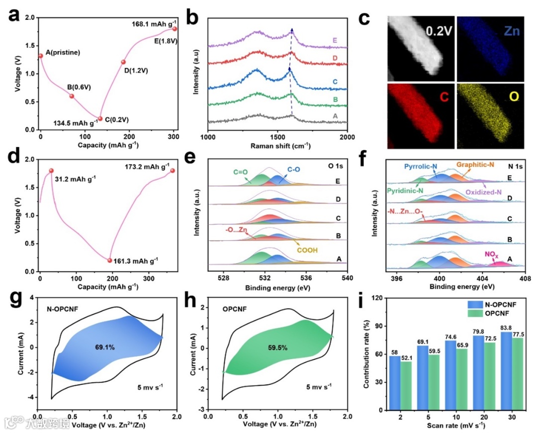 图3. (a) N-OPCNF的放充电曲线;(b) N-OPCNF的非原位Raman;(c) 放电至0.2 V时N-OPCNF的元素映射;(d) N-OPCNF的充放充电曲线;(e) N-OPCNF的非原位O 1s光谱;(f) N-OPCNF的非原位N 1s光谱;(g) N-OPCNF电极在扫速为5 mV s-1时总电流中的电容贡献;(h) OPCNF电极在扫速为5 mV s-1时总电流中的电容贡献;(i) 不同扫速下电容贡献占N-OPCNF电极和OPCNF电极总容量的比例
