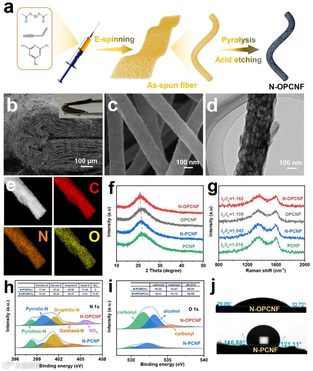 图1. (a) N-OPCNF的合成示意图;(b)和(c) N-OPCNF的SEM图像;(d) N-OPCNF的TEM图像;(e) N-OPCNF的元素分布图;(f) N-OPCNF及其对比材料的XRD图;(g) N-OPCNF及其对比材料的Raman图;(h) N-PCNF和N-OPCNF的N 1s光谱;(i) N-PCNF和N-OPCNF的O 1s光谱;(j) N-PCNF和N-OPCNF的水接触角