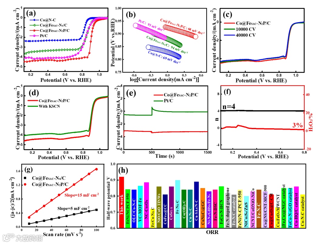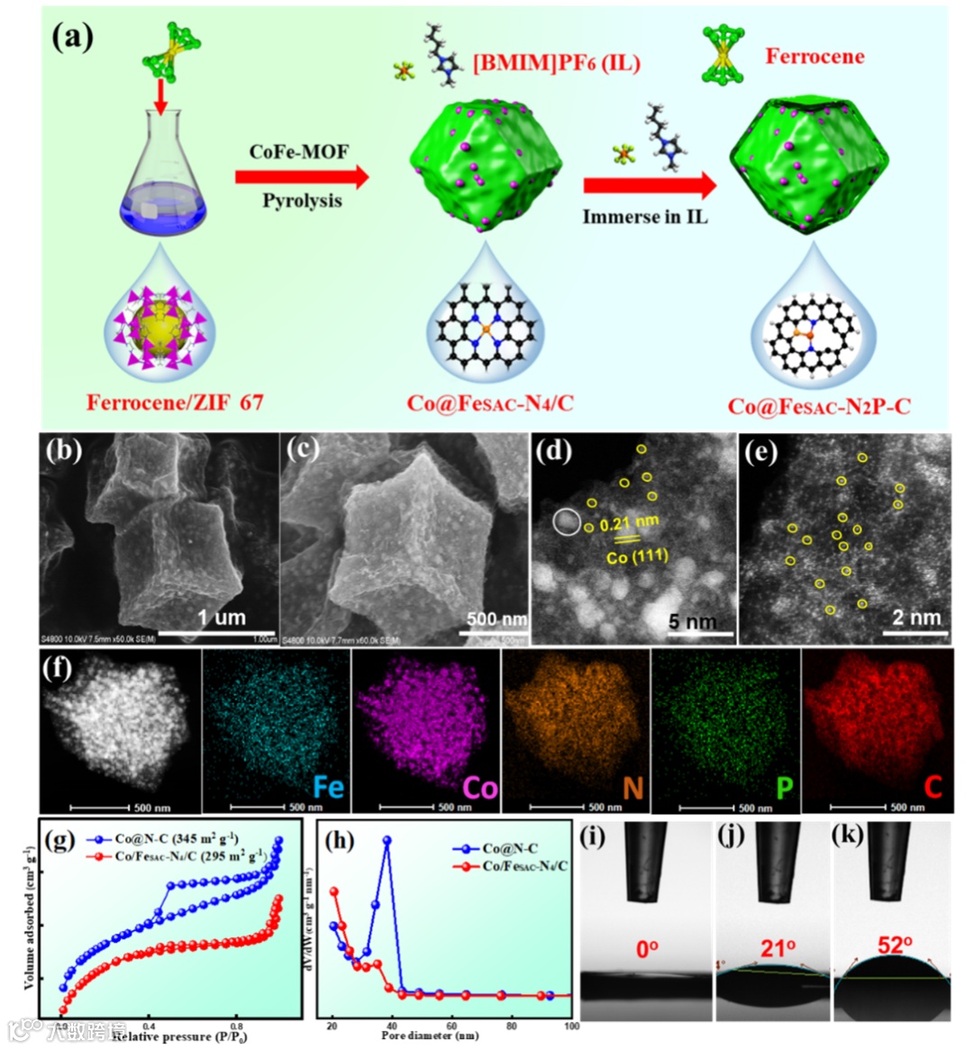 有鉴于此,内蒙古大学武利民教授团队王勤教授课题组与大连化物所张江威研究员合作,开发了一种独特的N、P双配位的Fe基单原子催化剂,该催化剂表现出优异的电催化氧还原反应性能。文章巧妙的通过离子液体的处理,在Fe-N4结构中引入次级P原子来调节Fe-N4物种的配位结构和局域电子结构。离子液体的引入不仅可以增强催化剂表面的疏水性,形成离子液体保护层,有效调控催化剂的反应界面微环境,而且可以显著提升催化活性和稳定性。