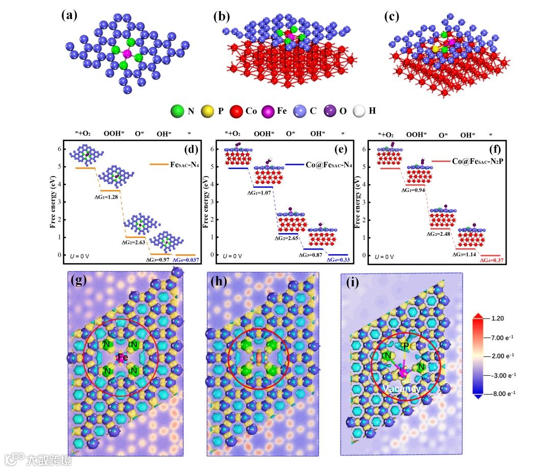 密度泛函理论计算结果表明,Fe-N2P混合配位和N空位的形成使Fe单原子活性位点周围富集更多的电子,有利于OOH*中间体的形成,从而改善催化剂反应动力学。