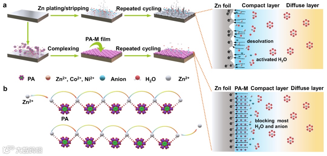 图1. a)纯锌和生长PA-M膜锌箔的界面反应示意图。b)Zn2+离子通过配位跳跃机制传输的动态配位过程