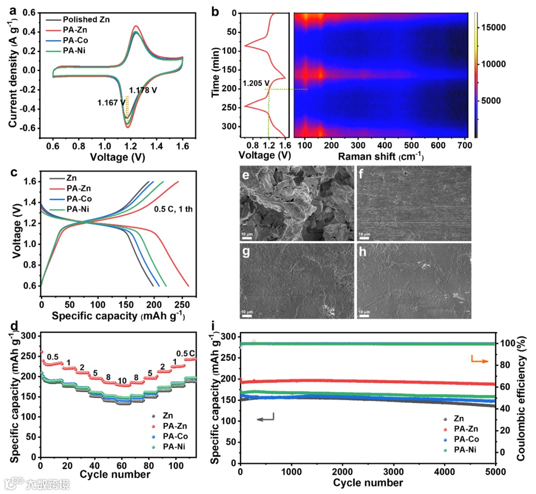 图4. a)在0.1 mV s-1扫速下,纯锌和带涂层锌负极锌碘电池的CV曲线。b)以PA-Zn为负极的锌碘电池原位拉曼光谱和相应的电压-时间曲线。c)0.5 C倍率下第一次充放电过程的电压-容量曲线。d)倍率测试。倍率测试后e)Zn,f)PA-Zn,g)PA-Co和h)PA-Ni的SEM图。i)5C下长循环性能