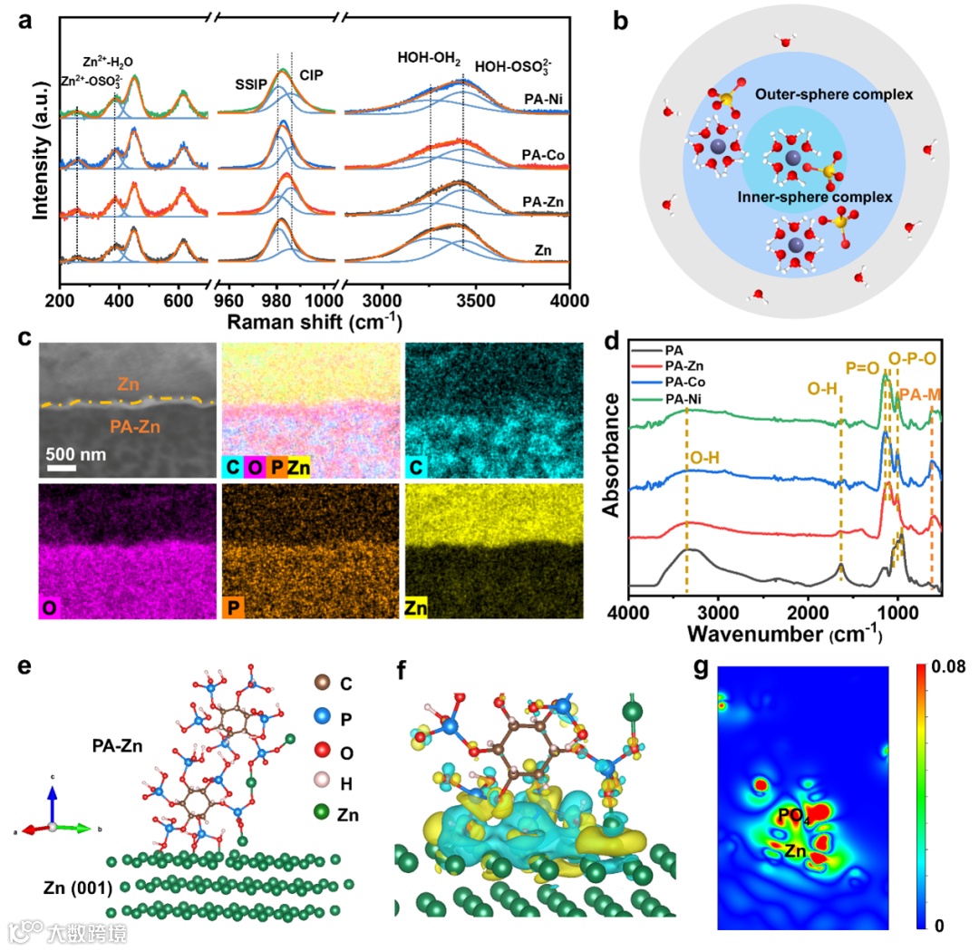图2. a)Zn、PA-Zn、PA-Co和PA-Ni表面2M ZnSO4的拉曼光谱。b)ZnSO4溶液结构示意图。c)PA-Zn和Zn界面的SEM和元素分布图。d)植酸溶液和PA-M的红外谱图。e)PA-Zn/Zn(001)的原子结构。f)PA-Zn/Zn(001)界面处的差分电荷密度图和相应的g)二维切面图