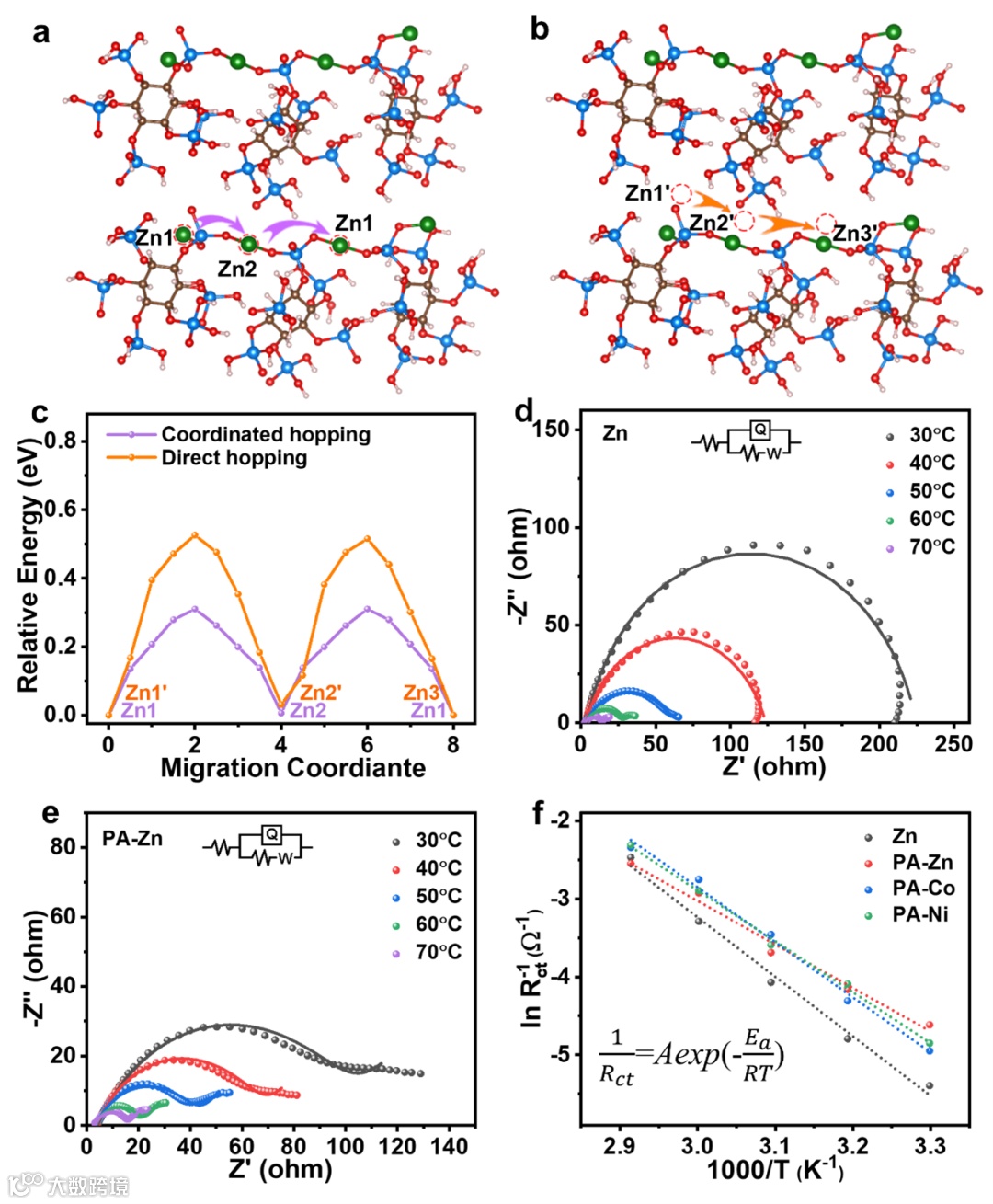 图3. 锌离子通过a)配位跳跃机制和b)直接跳跃机制传输的两种路径。c)两种传输机制对应的能垒。不同温度下d)Zn和e)PA-Zn的奈奎斯特曲线。f)阿伦尼乌斯曲线用于推导纯Zn和PA-M电极的活化能
