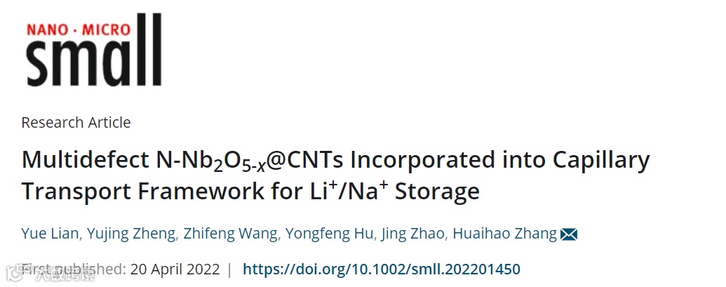 在这里,来自扬州大学的练越博士、张淮浩教授在国际知名期刊Small上发表题为“Multidefect N-Nb2O5-x@CNTs Incorporated into Capillary Transport Framework for Li+/Na+ Storage”的研究文章。