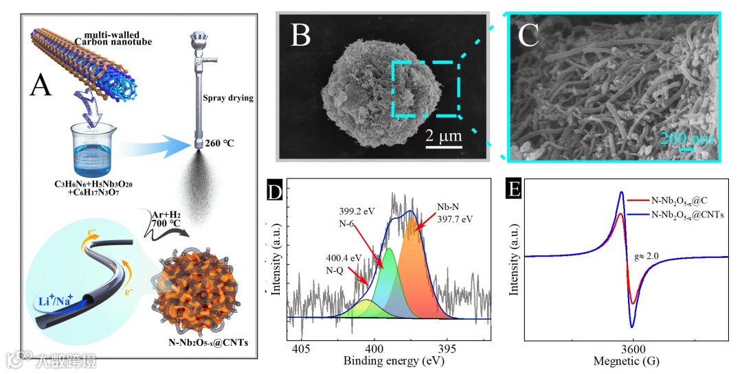 图1. Nb2O5-x@CNTs的制备流程图(A),SEM图(B, C),XPS图(D)和EPR(E)。