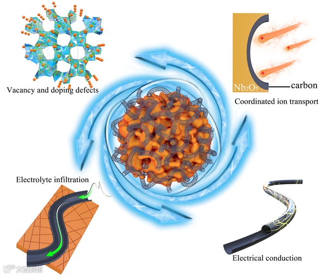 作为低应变、低传输能垒的离子嵌入型材料,五氧化二铌(Nb2O5)有待提高的离子传输速率和导电性是其在锂/钠离子储能体系中应用的研究重点。本工作将富含掺杂与空位双重缺陷的Nb2O5与贯穿体相的碳管相结合制备出微球复合材料(N-Nb2O5-x@CNTs)。贯穿Nb2O5微球体相的碳管促进电解液快速浸润微球体相,缩短Li+/Na+离子的传输路径。