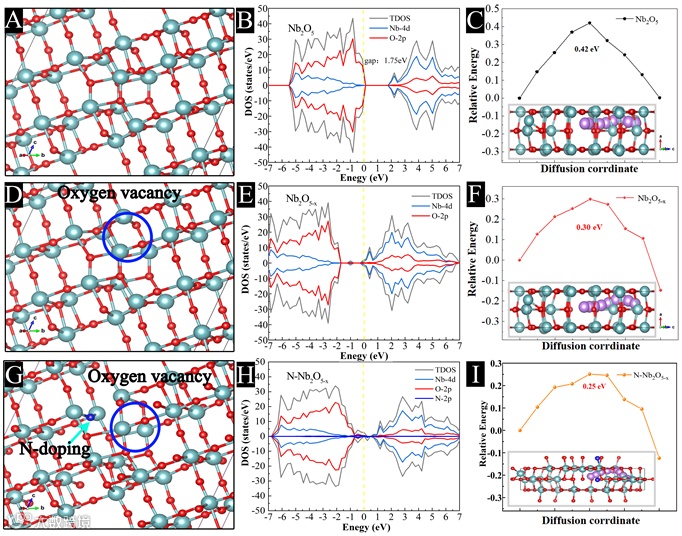 图2 Nb2O5在无缺陷(A~C)、氧空位(D~F)和双缺陷(氧空位和氮掺杂缺陷,G~I)下的DOS和传输能垒。