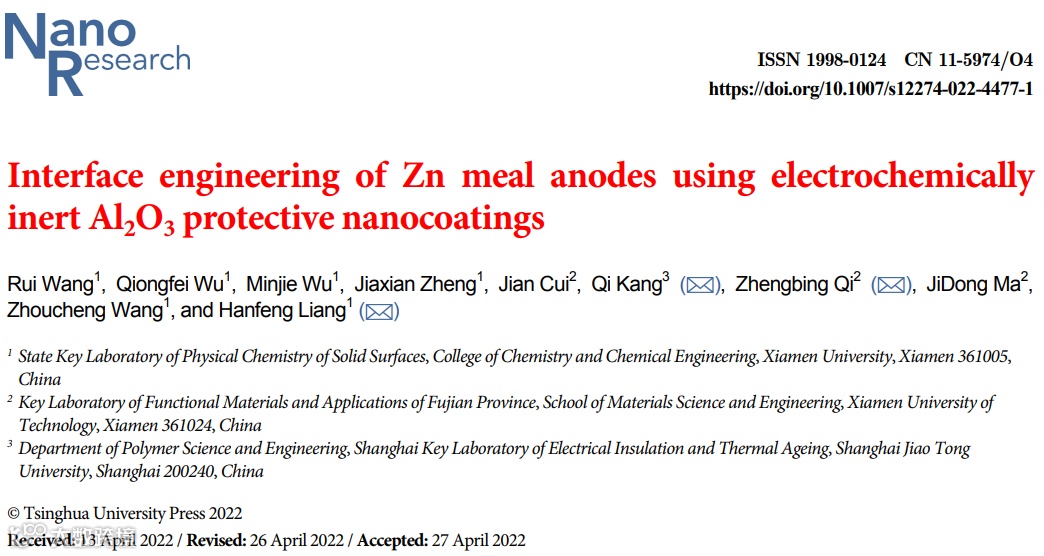 基于此,来自厦门大学的梁汉锋研究员,厦门理工学院祁正兵副教授和上海交通大学康琪博士团队合作,在国际知名期刊Nano Research上发表题为“Interface engineering of Zn meal anodes using electrochemically inert Al2O3 protective nanocoatings”的研究论文。
