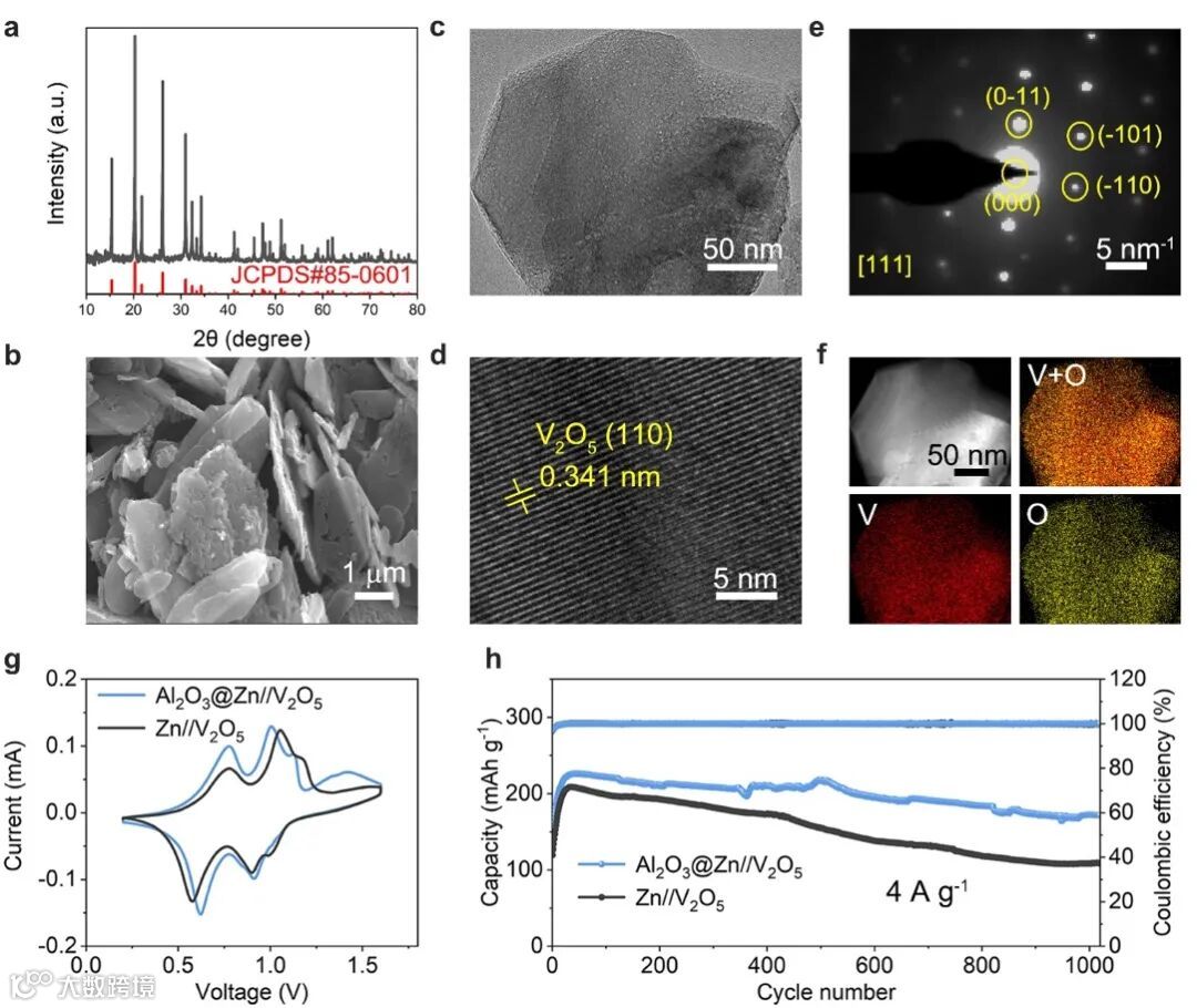 通过水热法成功制备了元素分布均匀的片状V2O5作为正极材料,与Al2O3@Zn负极和bare Zn负极分别组装成全电池进行电化学性能测试。CV曲线显示,Al2O3@Zn//V2O5全电池的还原峰与氧化峰之间的电位差更小,反应可逆程度更高。Al2O3@Zn//V2O5全电池在4 A g-1的测试条件下,循环1000圈后,容量保留率为76.11%,而bare Zn// V2O5电池的容量出现了快速衰减的现象。上述结果证明Al2O3纳米涂层改性能够有效地提升锌负极的循环稳定性。