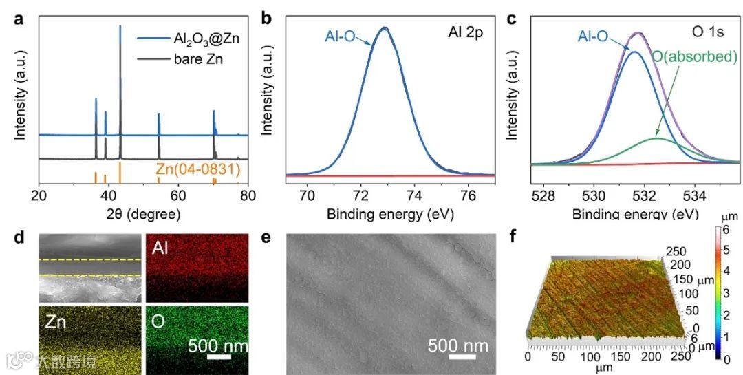 在本文中,利用脉冲磁控溅射技术,通过调节溅射时间调控Al2O3纳米涂层的厚度。如图1所示,制备了厚度约为400 nm、结构致密的Al2O3纳米非晶涂层,XPS数据显示Al2O3纳米涂层为化学计量比的氧化铝。SEM和3D激光共聚焦显微镜表征显示Al2O3@Zn电极表面成分分布均匀、结构致密。