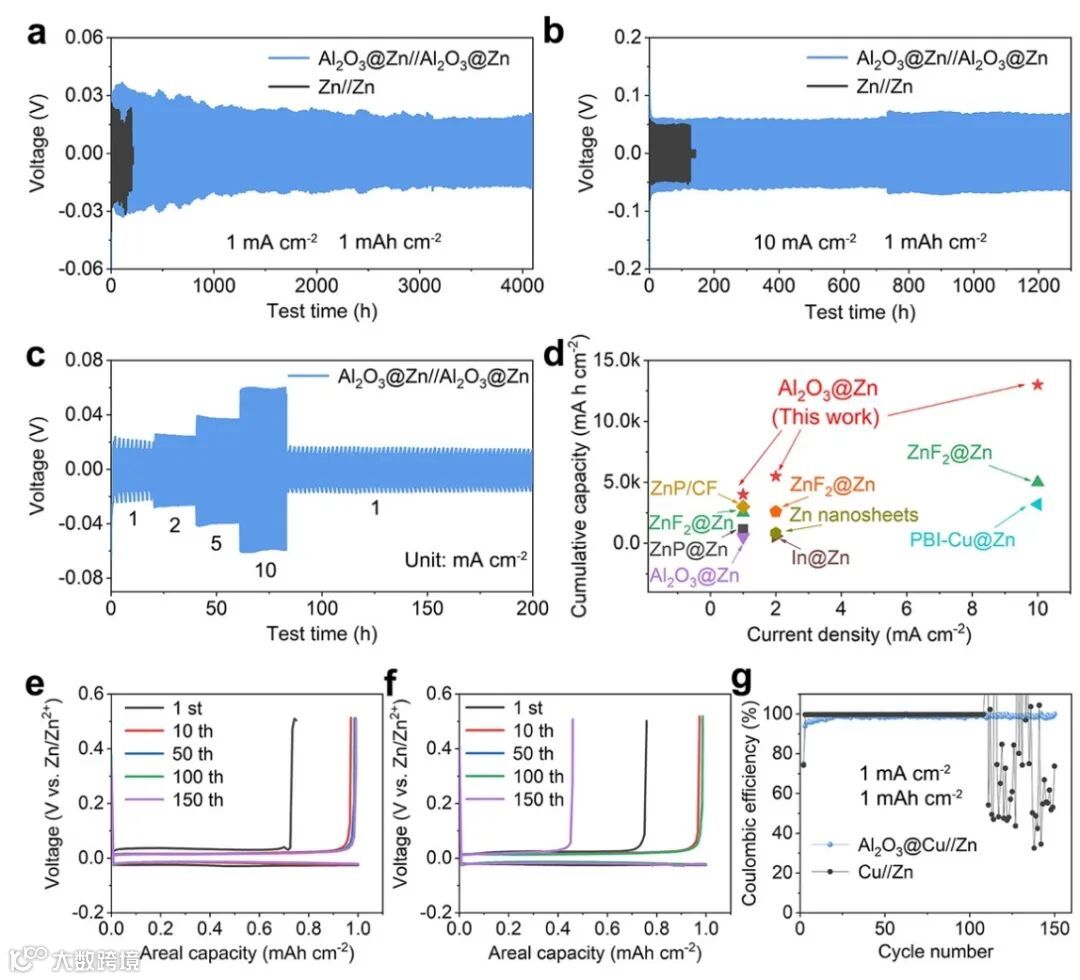 cm-2,1 mAh cm-2时,Al2O3@Zn负极半电池具有更优异的库伦效率。