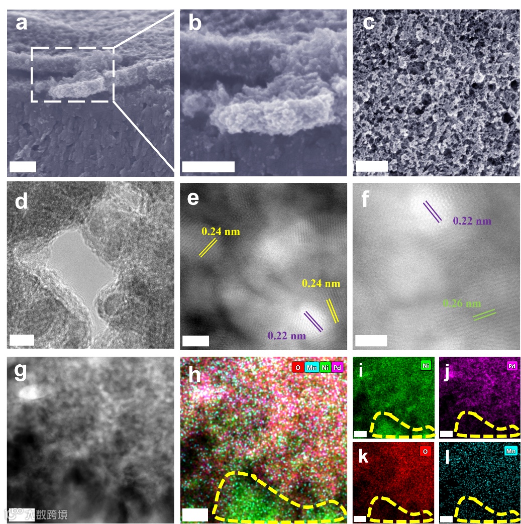 图2. PdNiMnO-PF电镜表征,(a-c) SEM 截面,放大及俯视图像,(d) HRTEM和(e-f)STEM-HAADF图像。(g)HAADF图像和(h-l)对应的EDS mapping。比例尺:(a-c)200 nm,(d)5 nm,(e-f)2 nm,(g-l)20 nm。