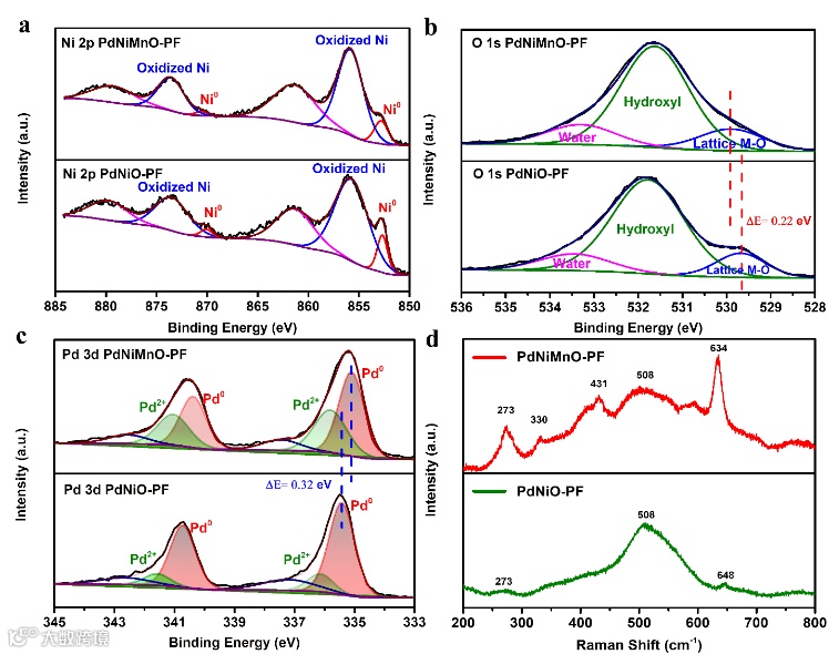 图3. (a). XPS Ni 2p 图谱,(b). XPS O 1s 图谱,(c). XPS Pd 3d 图谱,(d). 拉曼图谱。(对比样为PdNiMnO-PF和PdNiO-PF)