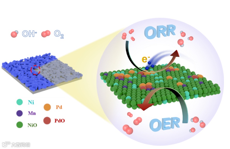 图1. 通过构建表面多孔结构促进Pd催化剂与功能基底(FOS)NiMnO的强相互作用界面。该示意图中,作为ORR活性相Pd的电子结构得到基底NiMnO的调控,并且NiMnO可作为OER的活性相,使得作为锌-空气电池的高效双功能催化剂得以实现。