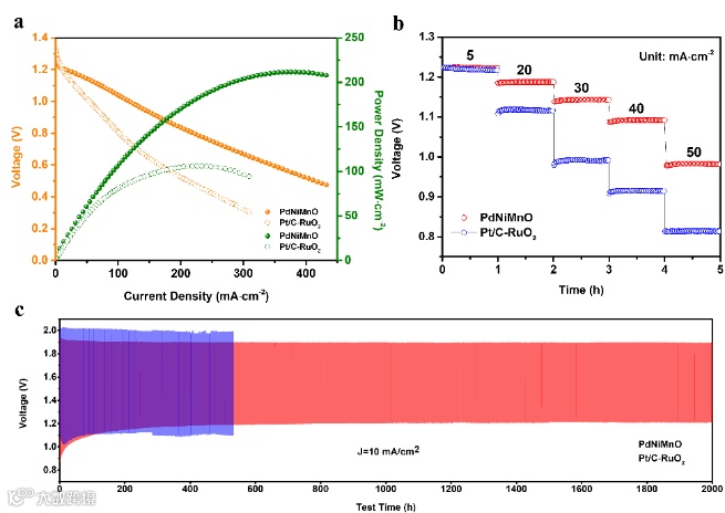 图4. (a). 催化剂在锌-空气电池中的极化和功率密度曲线,(b). 锌-空气电池的放电倍率曲线,(c). 锌-空气电池的长循环稳定特性。(对比样为PdNiMnO和Pt/C-RuO2