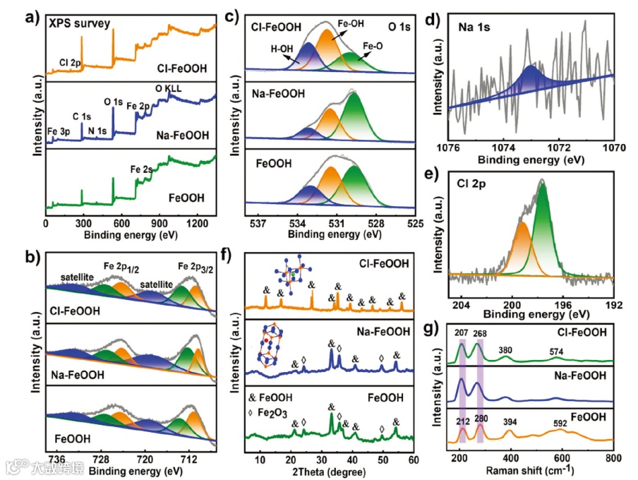 图2. a) XPS广谱;b) Fe 2p及c) O 1s的XPS高分辨谱(上方:Cl-FeOOH;中间:Na-FeOOH;下方:空白FeOOH);d) Na 1s及e) Cl 2p XPS高分辨谱;f) XRD谱图;g)拉曼光谱。