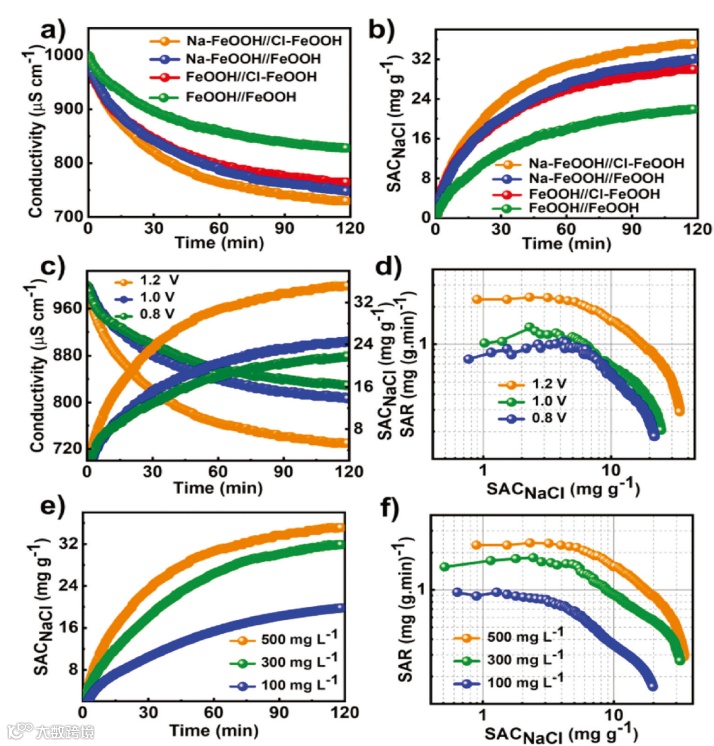 图5. 不同CDI器件的电导率vs.时间及b) SACNaCl vs.时间曲线;Na-FeOOH//Cl-FeOOH:不同电压下的c)电导率/SACNaCl vs.时间及d) Ragone曲线;不同浓度下的e) SACNaCl vs.时间及f) Ragone曲线。