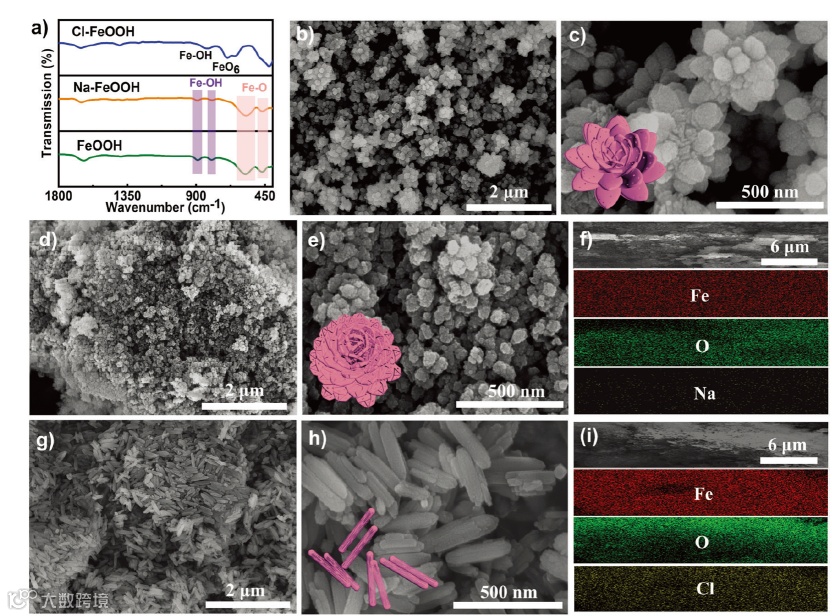 图3. a) FT-IR光谱;b, c) FeOOH,d, e) Na-FeOOH及g, h) Cl-FeOOH的SEM图像;f) Na-FeOOH及i) Cl-FeOOH的元素映射图像。
