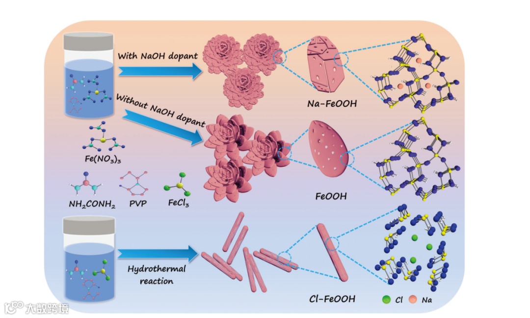 图1. Na-FeOOH,Cl-FeOOH及FeOOH的合成示意图。
