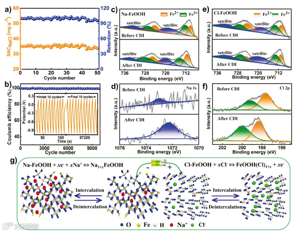 图6. Na-FeOOH//Cl-FeOOH器件的循环性能测试:a) SACNaCl/容量保持率vs.循环次数曲线及b) GCD循环及库伦效率曲线;Na-FeOOH电极吸附离子前后的c) Fe 2p及d) Na 1s XPS高分辨率光谱;Cl-FeOOH电极吸附离子前后的e) Fe 2p及f) Cl 2p XPS高分辨率光谱;g) Na-FeOOH//Cl-FeOOH器件的协同赝电容去离子化工作机理示意图。
