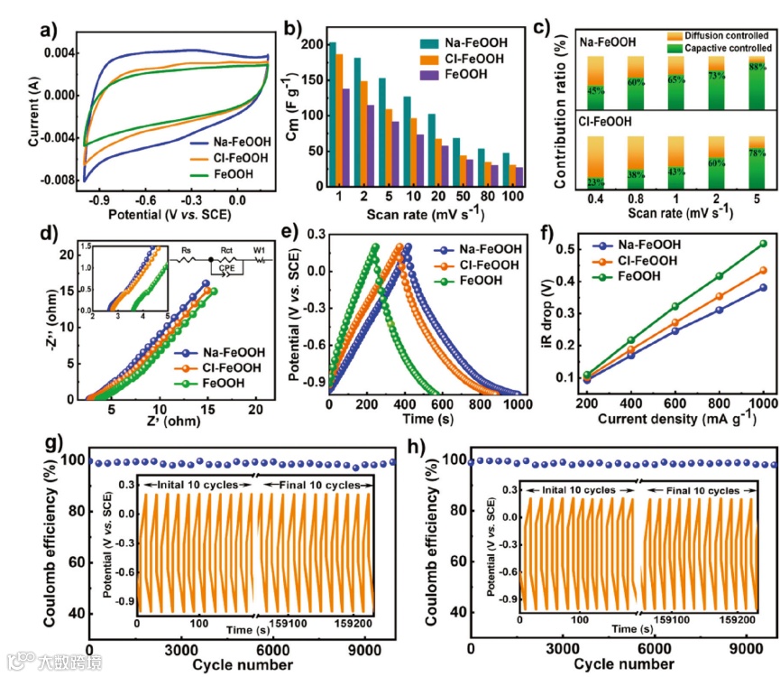 图4. a) 5 mV s-1 CV曲线;b) 比电容vs. 扫速曲线;c) Na-FeOOH及Cl-FeOOH的容量贡献曲线;d) Nyquist曲线;e) 200 mA g-1 GCD曲线;f) iR vs.电流密度曲线;g) Na-FeOOH及h) Cl-FeOOH的库伦效率曲线(插图为GCD曲线)。
