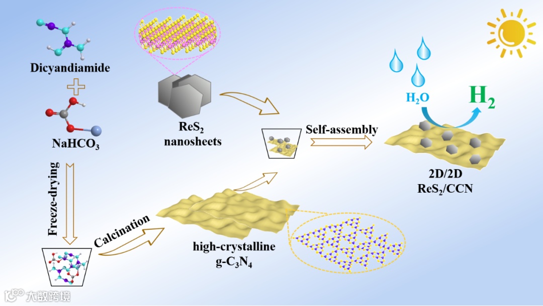 图1. 构建用于光催化析氢的2D/2D ReS2/CCN异质结示意图。