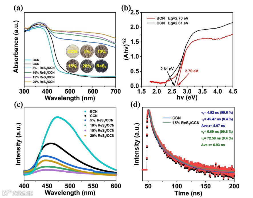 ReS2可以显著增强CCN的太阳光响应能力,有效拓宽CCN材料的可见光吸收范围,此外,高结晶结构以及范德华异质结的构建提高了CCN材料上光生载流子的分离和迁移效率,抑制光生载流子的重组,从而改善光催化活性。