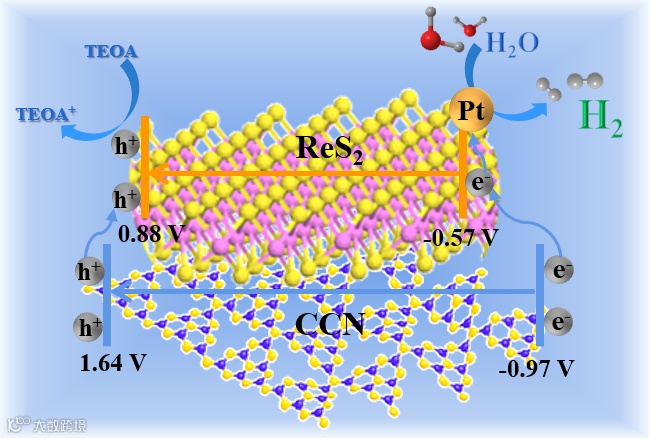 层状2D/2D ReS2/CCN异质结间的光生载流子高效分离和转移是提升其光催化活性的关键因素。在光照下,ReS2和CCN表面会产生光诱导的电子和空穴。根据能带理论,光生电子在CCN的导带上迅速通过异质界面迁移到ReS2上,然后在Pt助催化剂的协助下,ReS2导带上积累的电子将H+还原为H2。