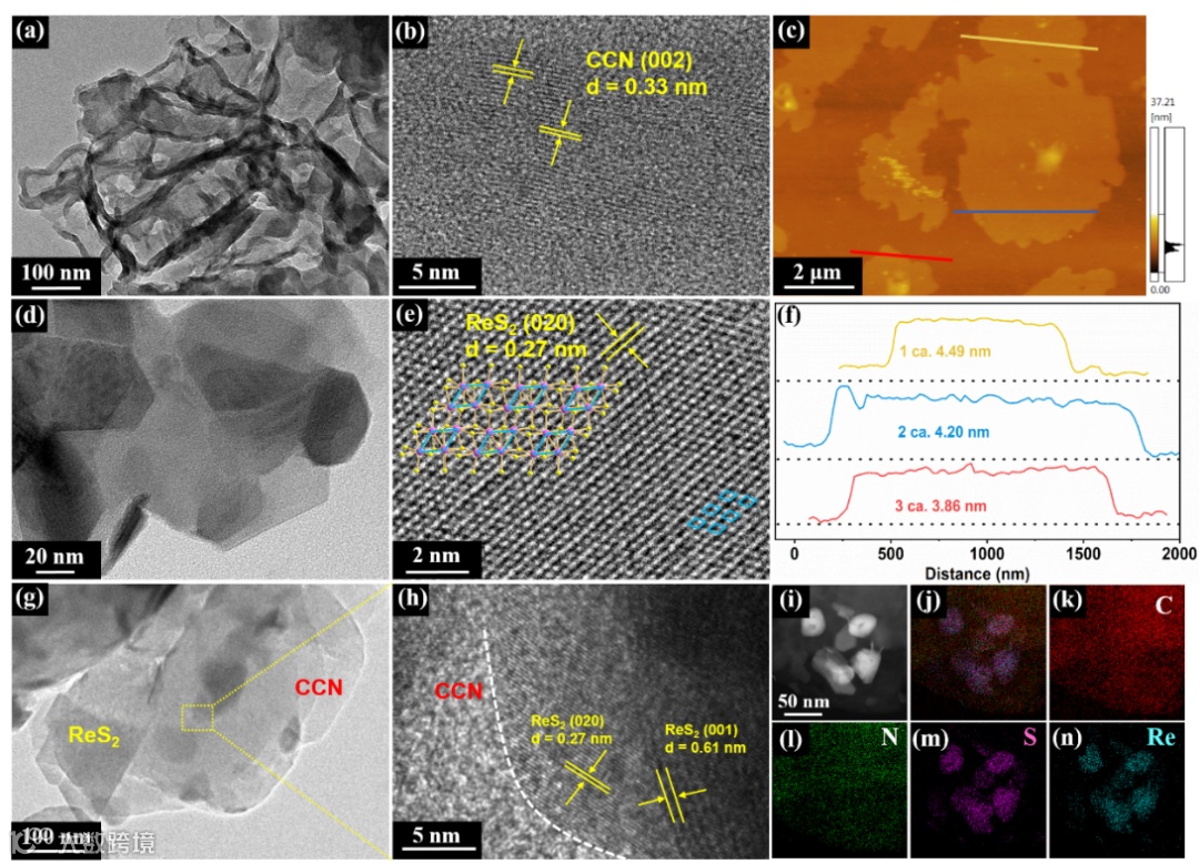 图2. (a-b) CCN, (d-e) ReS2纳米片,(g-h) 15% ReS2/CCN异质结的透射电子显微镜图和相应的高分辨透射电子显微镜图像。(c) ReS2的原子力显微镜图像和(f)相应的纳米片厚度剖面图。X射线能谱分析图:(i) 15% ReS2/CCN材料的扫描透射图, (j-n) 15% ReS2/CCN材料的mapping图,(k) C,(l) N, (m) S, (n) Re。