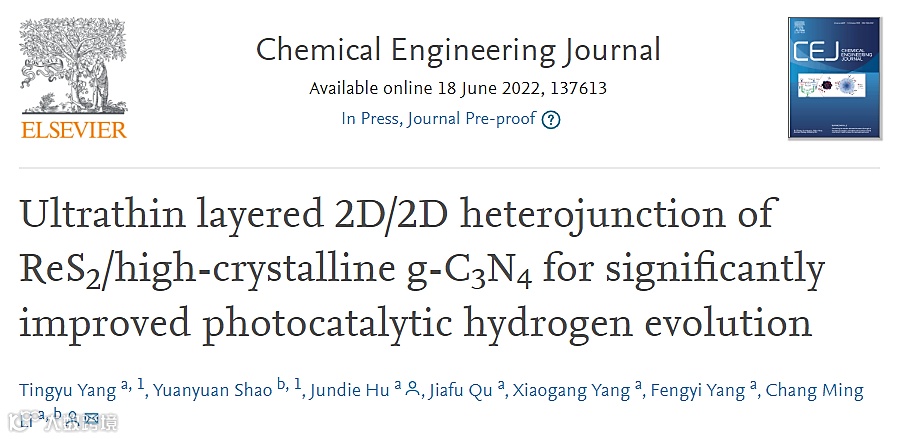 基于此,苏州科技大学胡俊蝶/李长明团队,在国际知名期刊Chemical Engineering Journal上发表题为“Ultrathin layered 2D/2D heterojunction of ReS2/high-crystalline g-C3N4 for significantly improved photocatalytic hydrogen evolution”的观点文章。