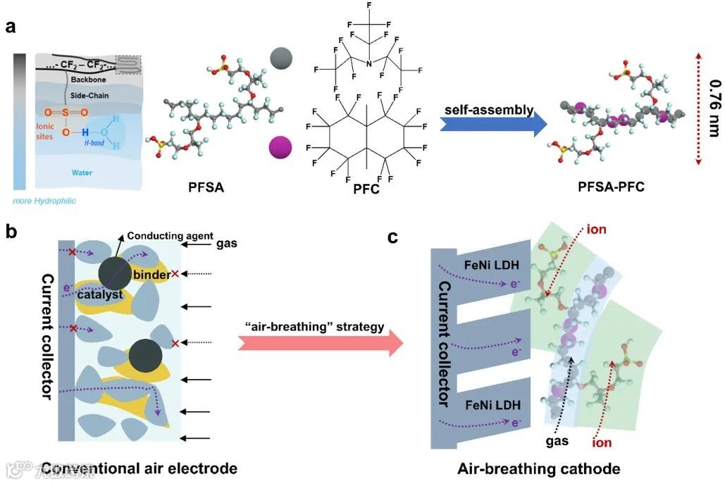 图1 (a) PFSA-PFC纳米乳液组装示意图,(b) “空气呼吸”策略电极结构示意图