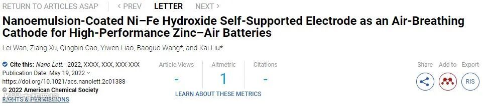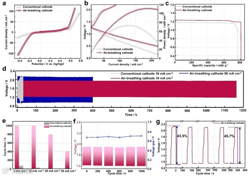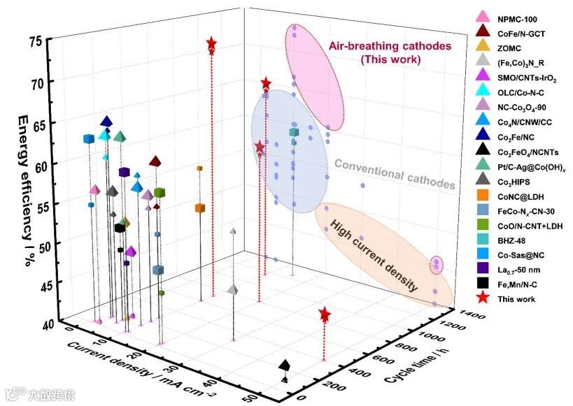 如图3所示,在锌-空气电池测试中,空气呼吸阴极具有优异的ORR/OER双功能催化活性。空气呼吸阴极的ORR极限电流密度在-0.4 V (vs. Hg/HgO)时急剧增加到100 mA cm-2, 而传统阴极的ORR极限电流密度仅为20 mA cm-2。空气呼吸阴极的峰值功率密度可达115 mW cm-2,比容量高达810 mAh gZn-1,在10 mA cm-2下稳定运行1100小时没有明显衰减。而传统阴极仅运行~30小时循环后出现严重性能衰减。如图4所示,与文献报道的体系相比,空气呼吸阴极在能量效率、循环寿命及工作电流密度等方面具有明显的优势。