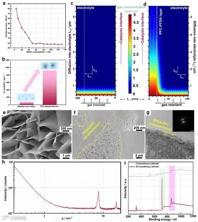 图2 (a) PFSA-PFC纳米乳液的界面张力,(b) PFSA-PFC的氧气溶解度,(c) 空气呼吸阴极中氧气传质理论模拟,(e) FeNi LDH的扫描电镜图,(f) 空气呼吸阴极的扫描电镜图,(g) 空气呼吸阴极的透射电镜图,(h) 空气呼吸阴极的广角X射线散射图,(i)空气呼吸阴极的XPS图谱