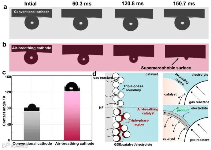 图5空气呼吸阴极的亲疏水和气体黏附性表征