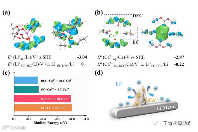 图6.Ca2+和Li+在EC/DEC中的还原电位及结合能理论计算