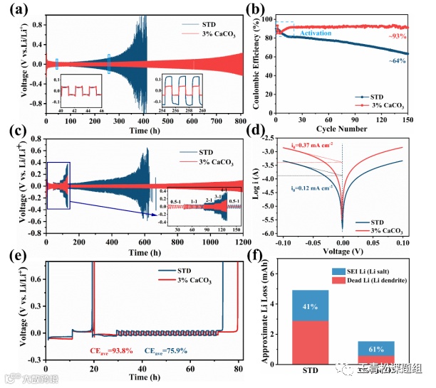 碳酸钙添加剂有效提升了锂金属负极的循环可逆性(图3a,b)和动力学过程(图3c,d),通过对Li损失的定量分析可以发现,改性电解液中的失活Li更多存在于SEI中而不是枝晶中,在保证了SEI离子电导率的同时减少了枝晶产生(图3e,f)。