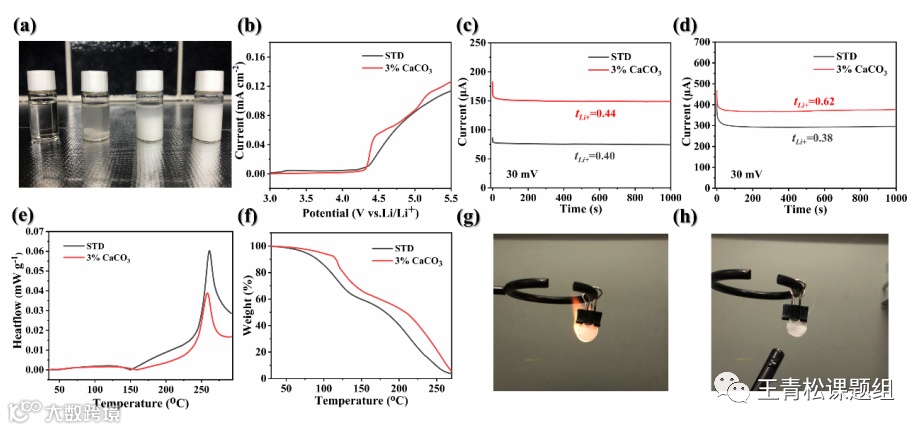 在纳米化和少量表面活性剂的作用下,碳酸钙在电解液中的分散性大幅提升(图2a),其固态特性减少了对电解液分解电位的干扰(图2b)。经过一段时间循环后,添加剂释放的Ca2+增强了对阴离子的吸附效果,使得Li+迁移数得到了提升(图2c,d)。DSC和TG结果表明,碳酸钙添加剂的加入减少了电解液的热分解产热及挥发性,并使得电解液更难被点燃(图2e-h)。