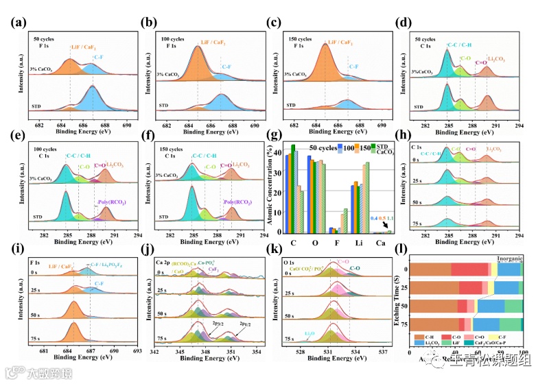 基于对不同循环时间和不同深度的XPS结果进行处理,可以得到SEI成分的时空分布规律。随着循环的进行,改性添加剂SEI中F含量更高(图4a-g),而SEI内层以无机盐为主,外层以有机物为主(图4h-l)。这种内外软硬搭配的结构可以更有效的缓解Li金属体积膨胀,而较为恒定的Li2CO3含量说明了添加剂减少了HF对SEI的腐蚀。