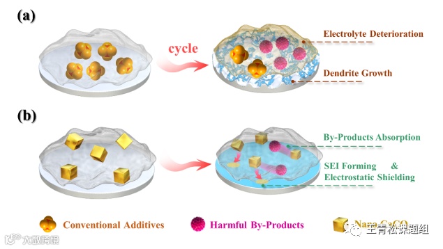 图1. a)传统电解液添加剂的弊端,b)纳米碳酸钙添加剂的缓释机制