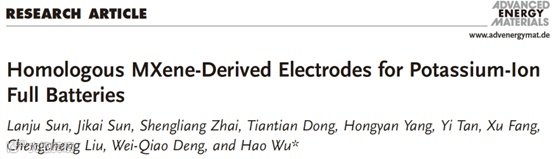 基于此,山东大学吴昊教授课题组等人提出了一种解锁部分MOF节点的策略,用于提高钾离子吸附能,从而实现钾离子存储容量的大幅提升。采用同源的MXene制备了高性能钾离子电池正极和负极材料,并组装钾离子全电池,展现出高能量密度和功率密度,推进了新储能系统的发展。该成果以“Homologous MXene-Derived Electrodes for Potassium-Ion Full Batteries”为题发表在国际著名期刊Advanced Energy Materials上,并被选为封底。