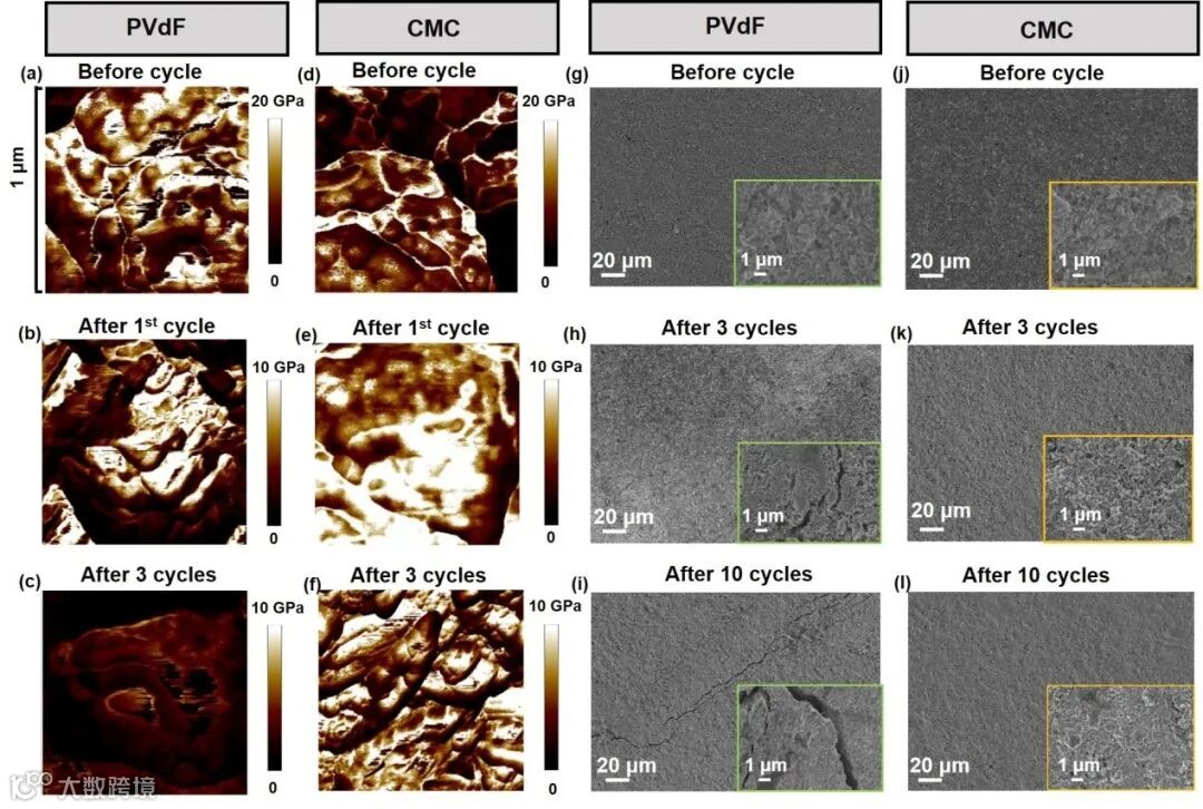粘结剂主要在电极工作的过程中起到黏附集流体、电极材料及导电剂的作用。循环前,类似的杨氏模量数值分布说明以PVdF与CMC作为粘结剂具有接近的本征黏附能力。然而在循环之后,PVdF发生不可逆的电化学还原脱氟,其粘合能力迅速减弱,杨氏模量明显降低,电极极片逐渐破裂。而CMC粘结剂多次循环后仍旧发挥着粘结剂的作用,极片完整性良好。