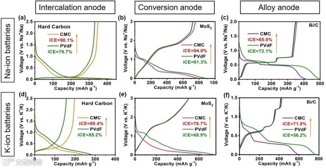 导读:该论文以TiO2为研究对象,以PVdF和CMC为常见粘结剂的代表,评估其在钠/钾离子电池中的电化学性能