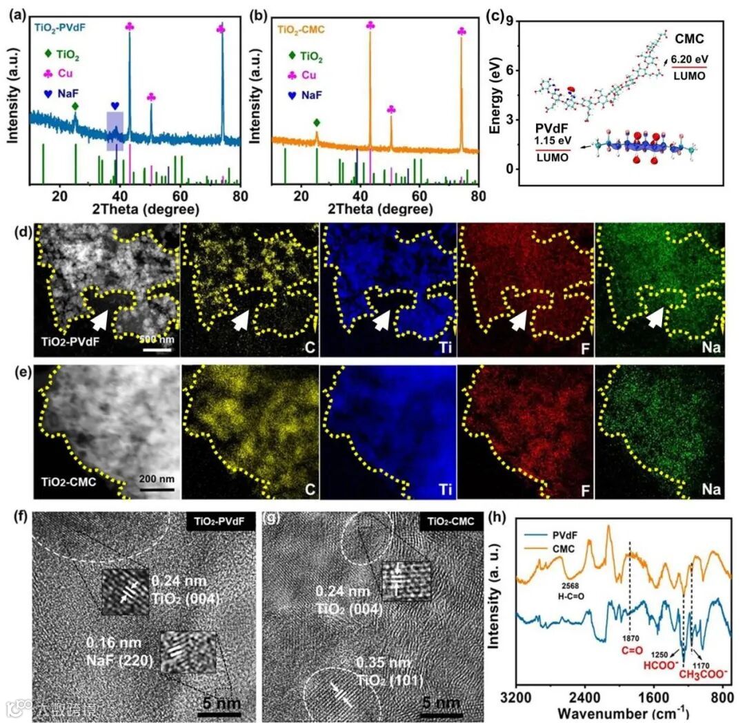 图2. 以PVdF或CMC为粘结剂的二氧化钛电极在循环后的组分和结构表征。