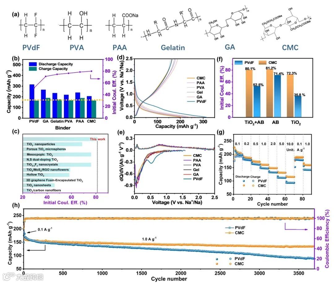 图1. 使用不同粘结剂时TiO2的储钠电化学性能。