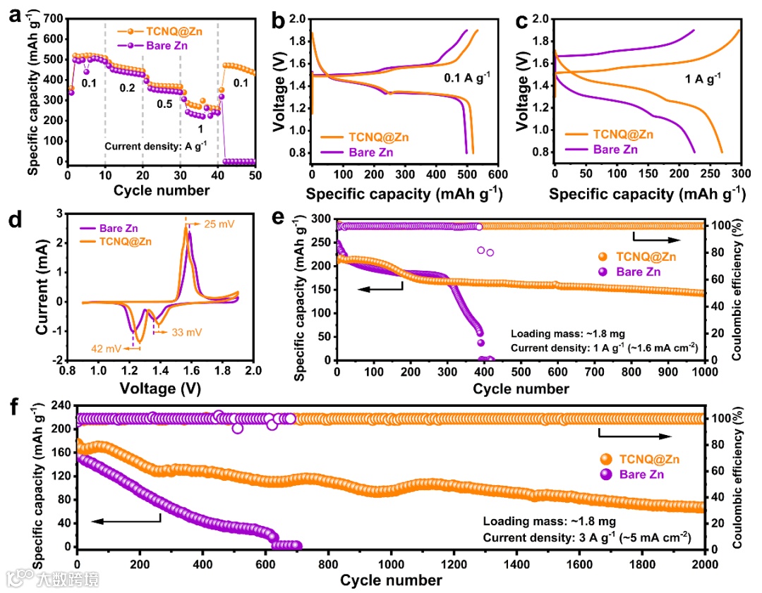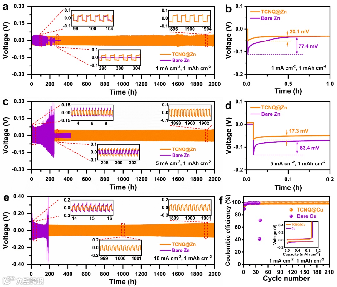 如图2所示,TCNQ@Zn负极显著改善了水系锌基电池的循环寿命与库伦效率。相比于bare Zn负极在测试条件为1/5/10 mA cm-2,1 mAh cm-2时,TCNQ@Zn对称电池的循环寿命均超过2000小时。同时,1 mA cm-2,1 mAh cm-2条件下的半电池测试表明,TCNQ2-改性层有效改善了锌沉积/剥离的可逆性。