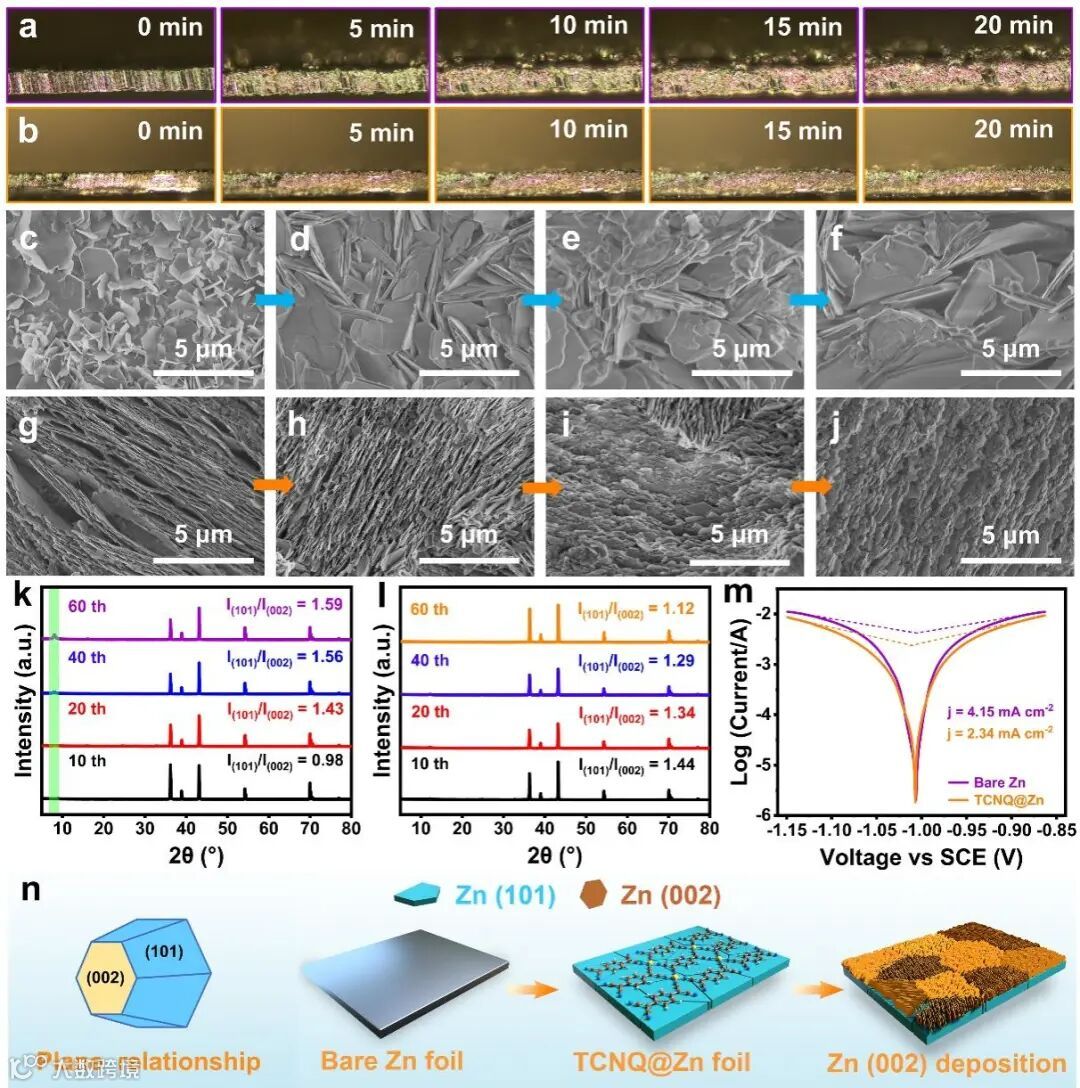 因此,TCNQ2-改性Zn(101)面能有效锚定吸附成核的锌原子,限制其在Zn(101)表面的扩散,并迫使其沿Zn(002)面扩散生长。因此,TCNQ2-对Zn2+的离子泵送协同Zn(101)晶面的原子锚定效应,可以诱导有序的Zn(002)取向沉积,抑制锌枝晶形成和表面钝化反应。