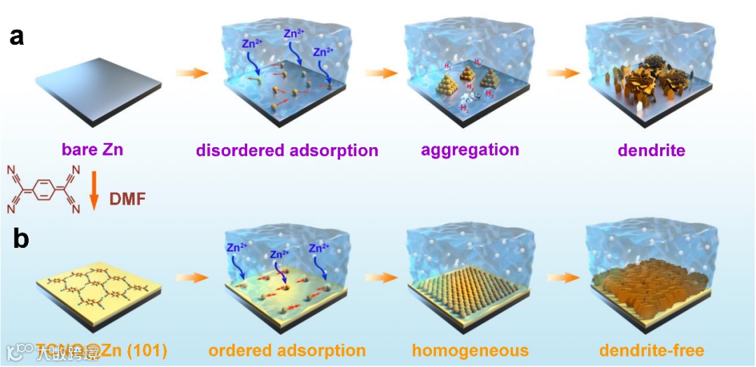 图1. 未改性锌负极与TCNQ@Zn负极表面锌沉积示意图