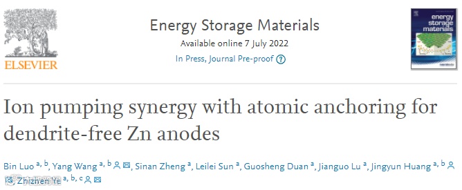 基于此,来自浙江大学的叶志镇院士团队的黄靖云教授与汪洋博士,在国际知名期刊Energy Storage Materials上发表题为“Ion pumping synergy with atomic anchoring for dendrite-free Zn anodes”的研究工作。